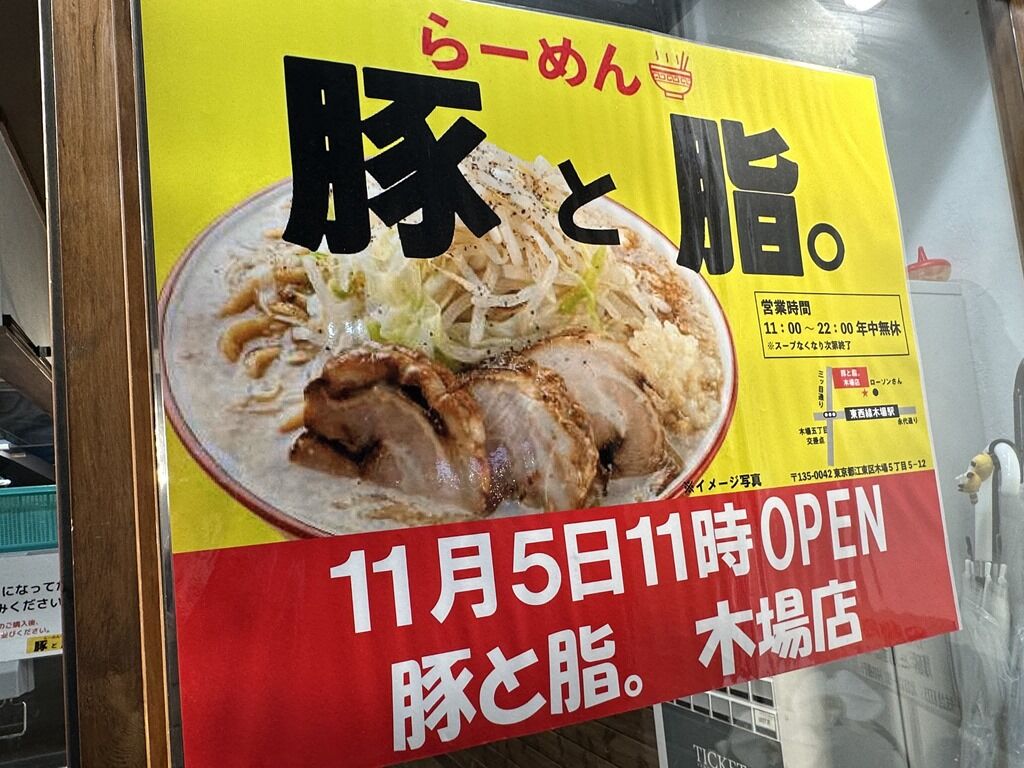 店の場所は、木場駅各出口から徒歩約2分。永大通り沿い。1番・2番出口からだと永大通りを渡らずに済みます。トナリ木場店→バシンラン→鬼豚オーガと松富士食品系列店がリニューアルを繰り返した跡地。六厘舎関連店の後につじ田関連店という構図。