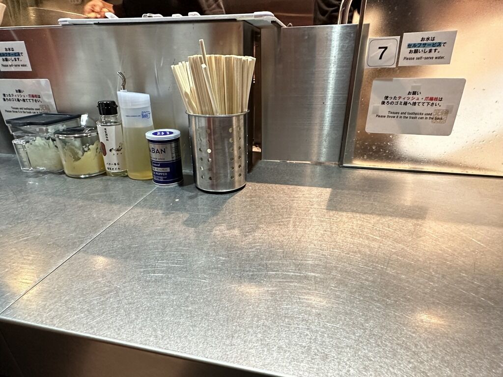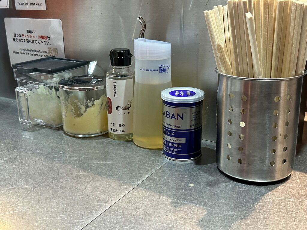 BGMはJ-POP、back number「手紙」が泣けます。箸は割り箸。卓上調味料はきざみ玉ねぎ、おろしニンニク、バター香る燻製オイル、GABANブラックペッパー。「バター香る燻製オイル」は通常有料トッピングのところ特別に(年内限定?)無料提供。