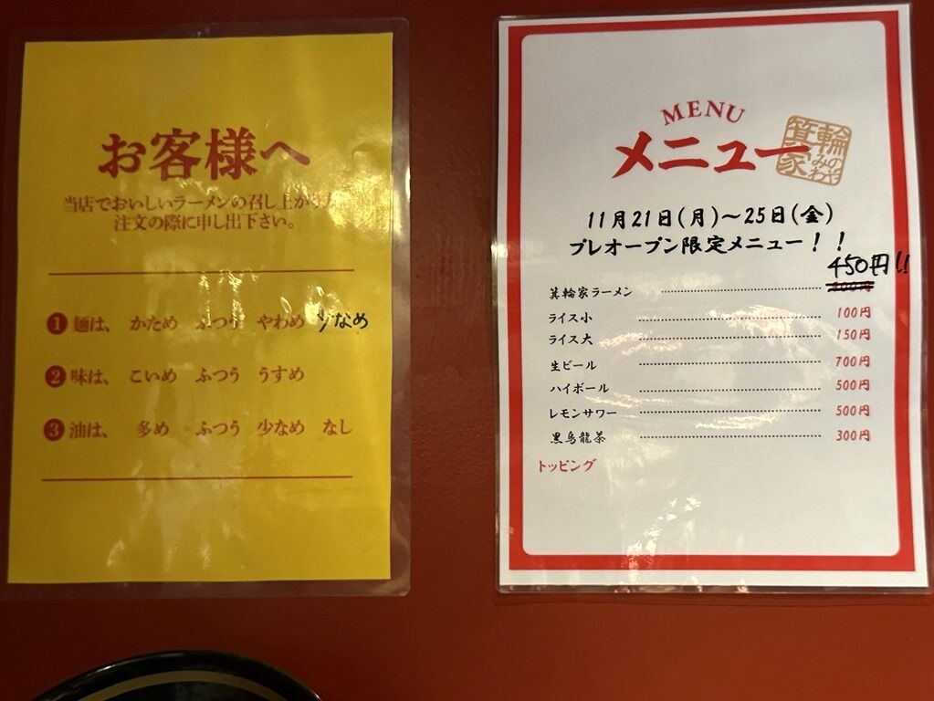 メニューは箕輪家ラーメン900円(プレオープン中は450円)、他にライス、アルコール類。お好みは会計時に聞かれます。