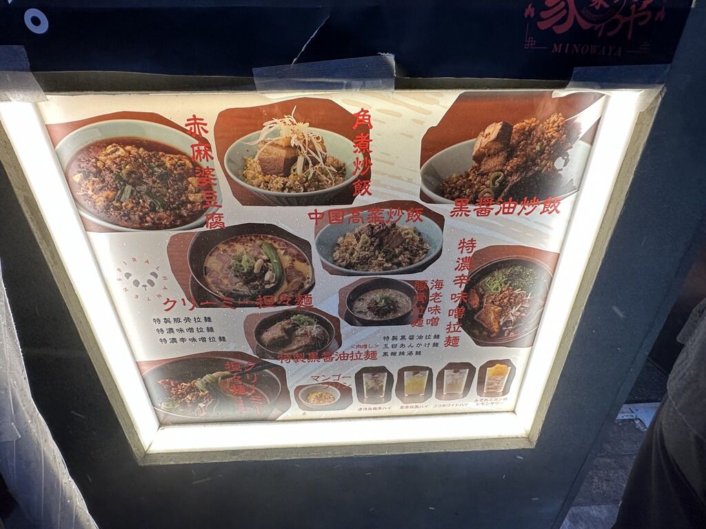 店の場所は中野駅北口徒歩約5分。民家→(建て替え)→スパイラル飯軒と入れ替わった跡地。店頭の前店画像付きメニュー1枚はポスターで隠されてますが、下のもう1枚はそのまま。