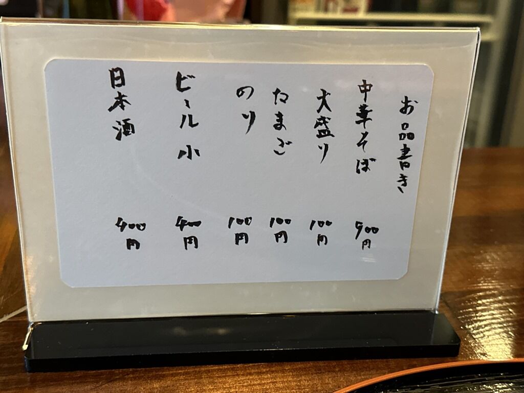券売機は無く後会計制。メニューは、中華そば900円、大盛り100円、たまご100円、のり100円、ビール小400円、日本酒400円。日本酒は御徒町の「ふくはら酒店」から取り寄せで常時2種類以上用意。着席すると並か大盛りか聞かれます。