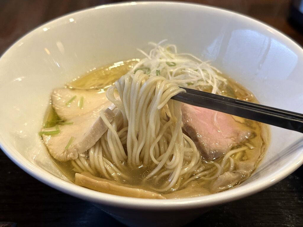 麺はストレート中細タイプ。しなやかでなめらかな質感と、適度な跳ね返りを感じる弾力のあるコシ。あっさりコクうまスープに食感の良い麺がいいハーモニーを奏でます。