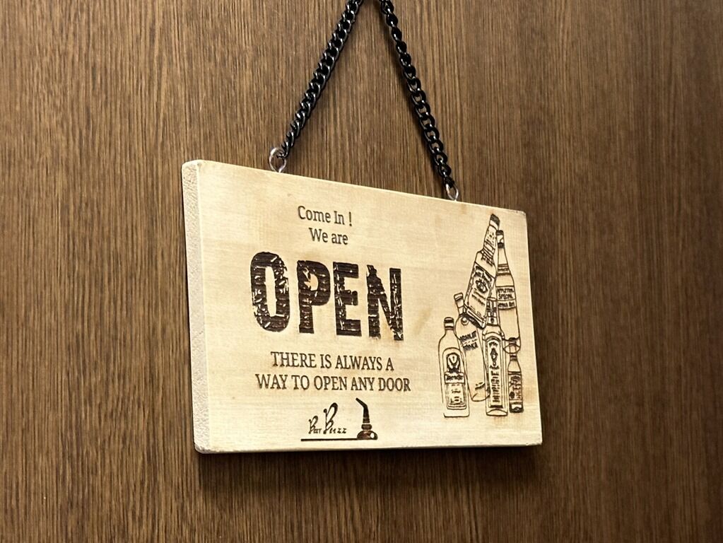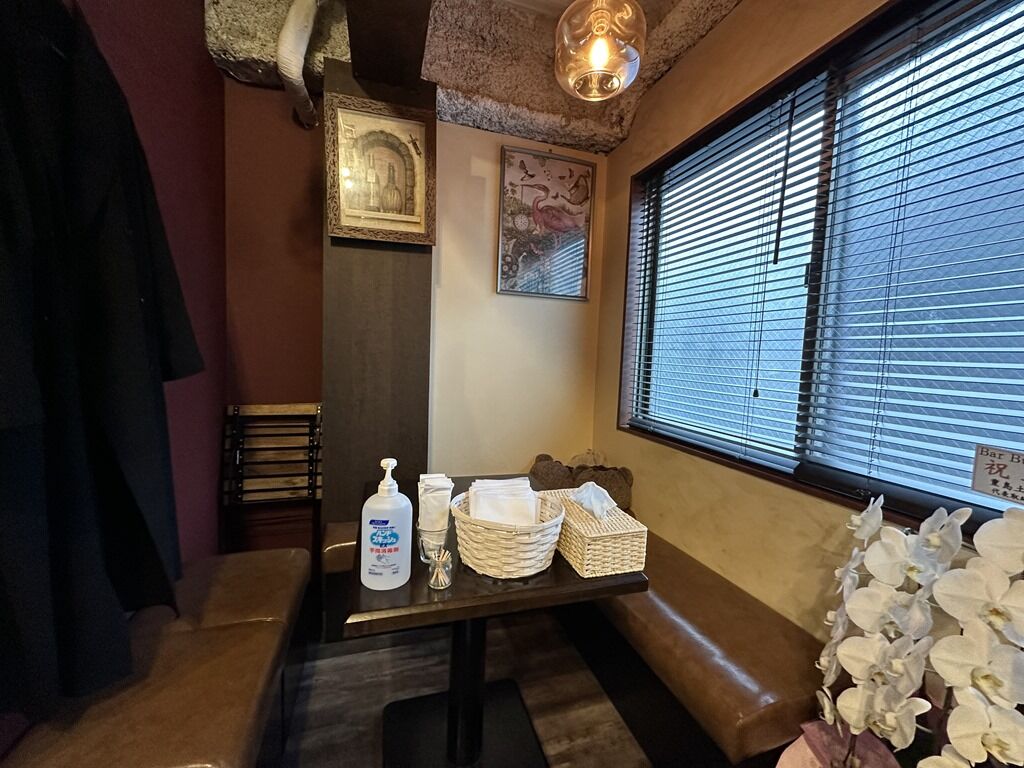 店内は出入口近く一角がカーテンで仕切られた厨房で、奥に広がるバーカウンターが客席スペース。席は真っ直ぐなカウンター5席。L字カウンターですが小辺は未使用。4人卓x1がありますが未開放。