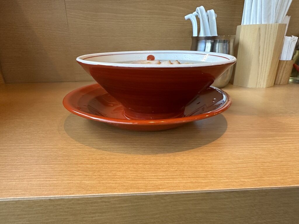 器の内側に大きな赤い字で描かれているのは「鳥」の字。赤い受皿付き、サイドが赤い高台丼で着丼。