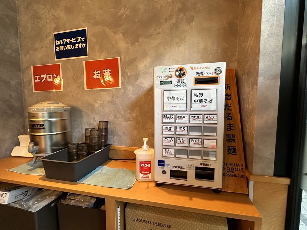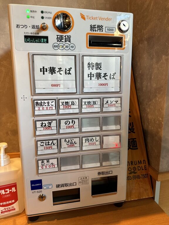 入店するとまず券売機で食券購入です。主なメニューは、中華そば680円、特製中華そば1000円、肉めし350円、他。券売機の前に立つと、厨房から「中華そばはチャーシューしか入ってません」と声がかかります。