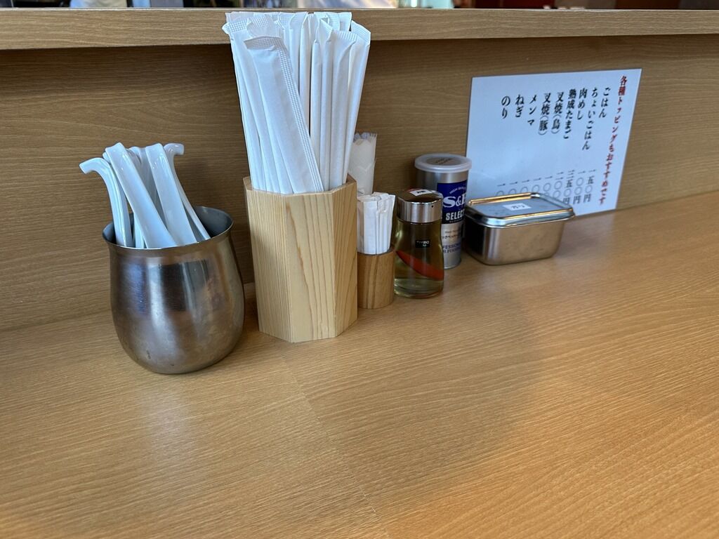 BGMはポップス。セルフのお茶は冷たい麦茶。箸は割り箸。酢、S&Bブラックペッパー、ガリ。ガリは白い甘酢生姜で、寿司に添えられるあれ。