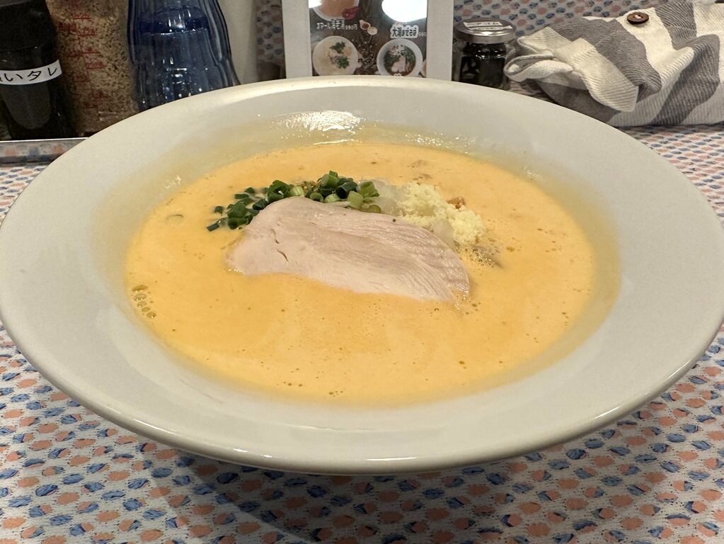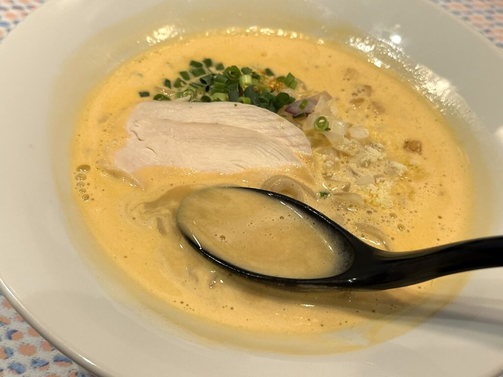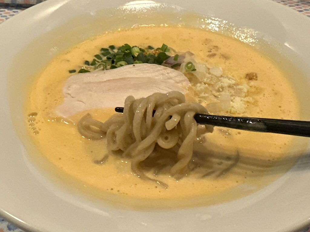 スープはとろっと濃厚な白湯海老味。クリーミーでミルキーで、まさにオマール海老のポタージュと呼びたい一品。ラーメンというよりスープパスタ感覚で、タバスコが似合いそうなイタリアン仕立て、もしくはフレンチの海老のビスクみたいな洋風テイスト。〆にライス投入してリゾットにしたくなる味わいでとても美味しい!