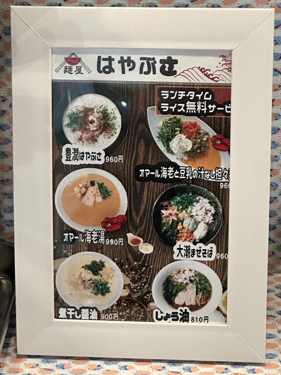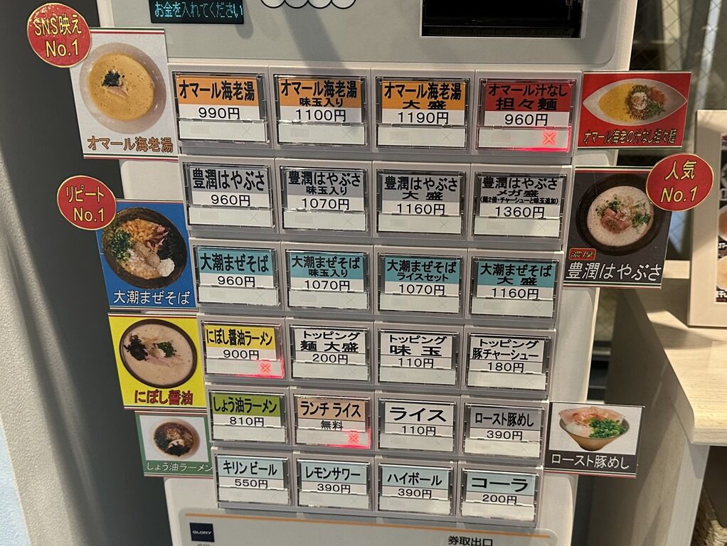 入店するとまず券売機で食券購入です。主なメニューは、オマール海老湯990円、オマール汁なし担々麺960円、豊潤はやぶさ960円、大潮まぜそば960円、にぼし醤油ラーメン900円、しょう油ラーメン800円、ロースト豚めし390円、他。