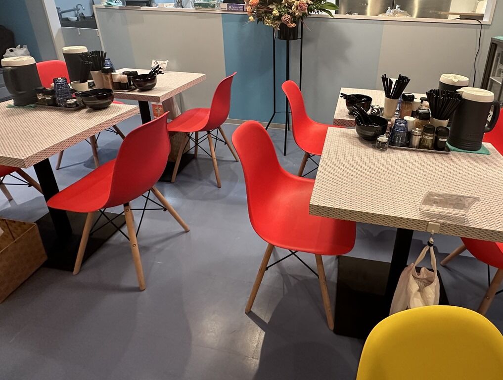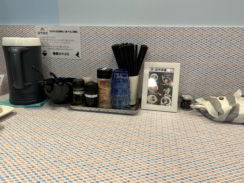 19:30頃到着で先客3、後客3。スタッフは男性2。BGMはポップス。箸は洗い箸で資源環境に配慮。卓上調味料は、唐辛子粉、ブラックペッパー、フライドガーリック、昆布酢、追いタレ。