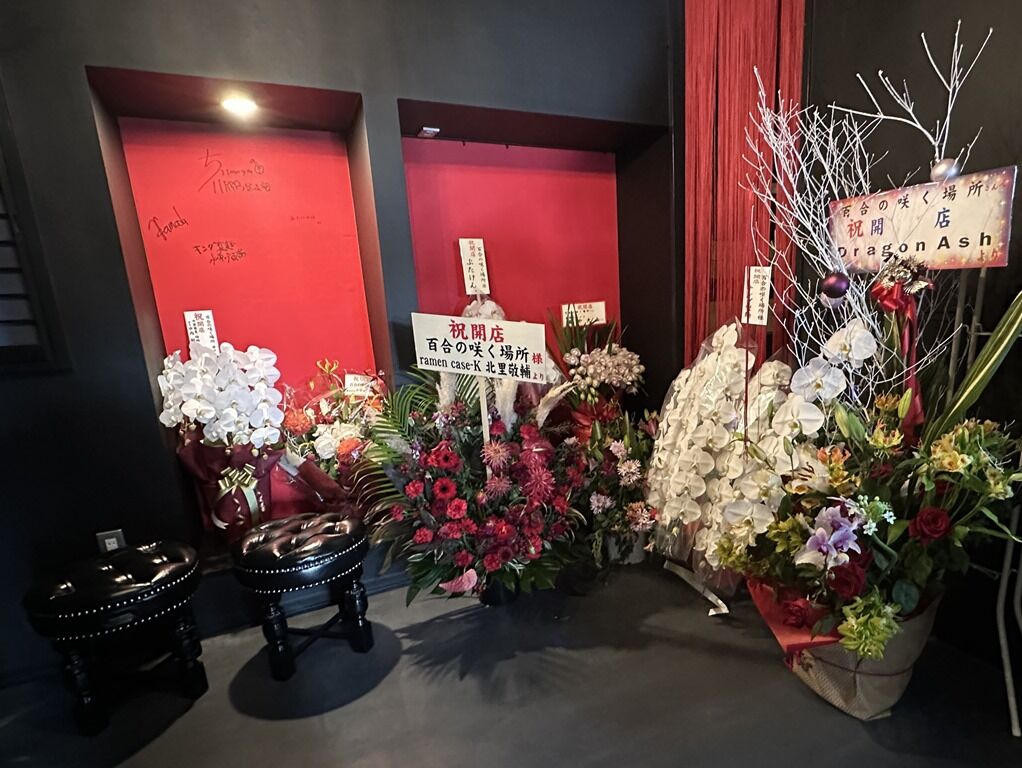 店内の胡蝶蘭と花は、中華蕎麦 時雨、ぶたけん、ramen case-K、麺や大山、キング製麵、麺処晴、Bonito Soup Noodle RAIK、そしてDragon AshからΣ(・ω・ノ)ノ!