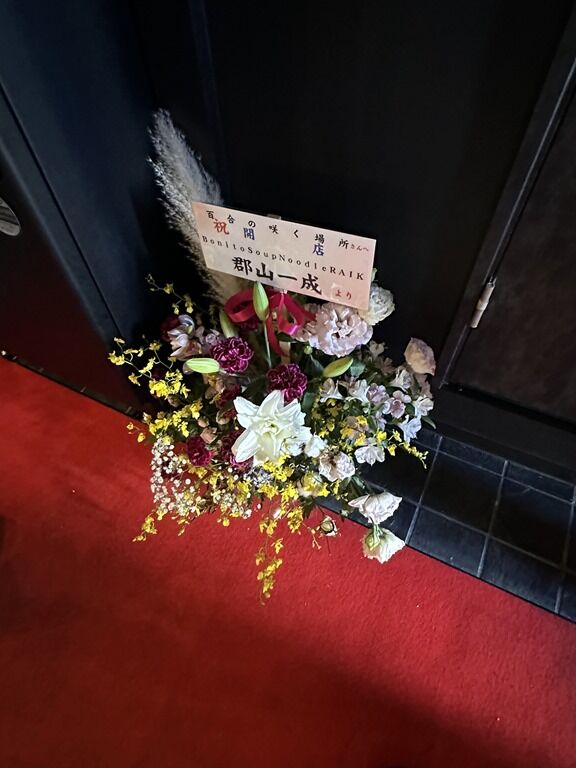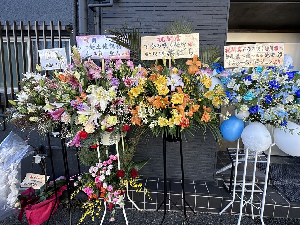 店頭開店祝花は、麺処にし尾、らー麺土俵 鶴嶺峰、塩そば専門店 桑ばら、麺屋龍~継、麺処 有彩から。