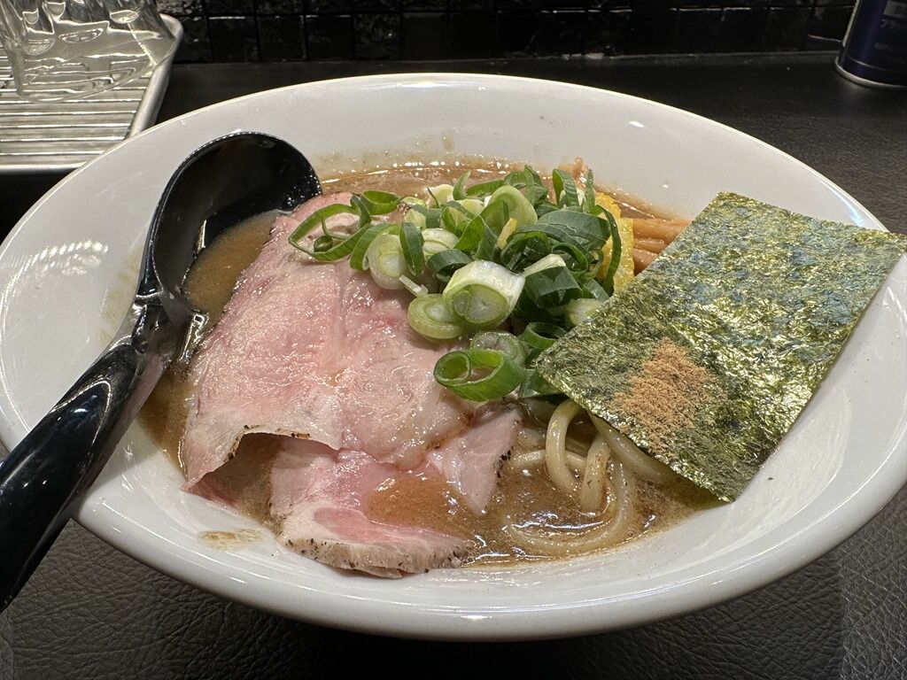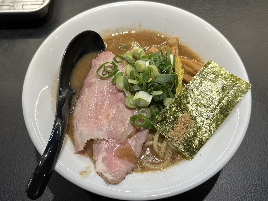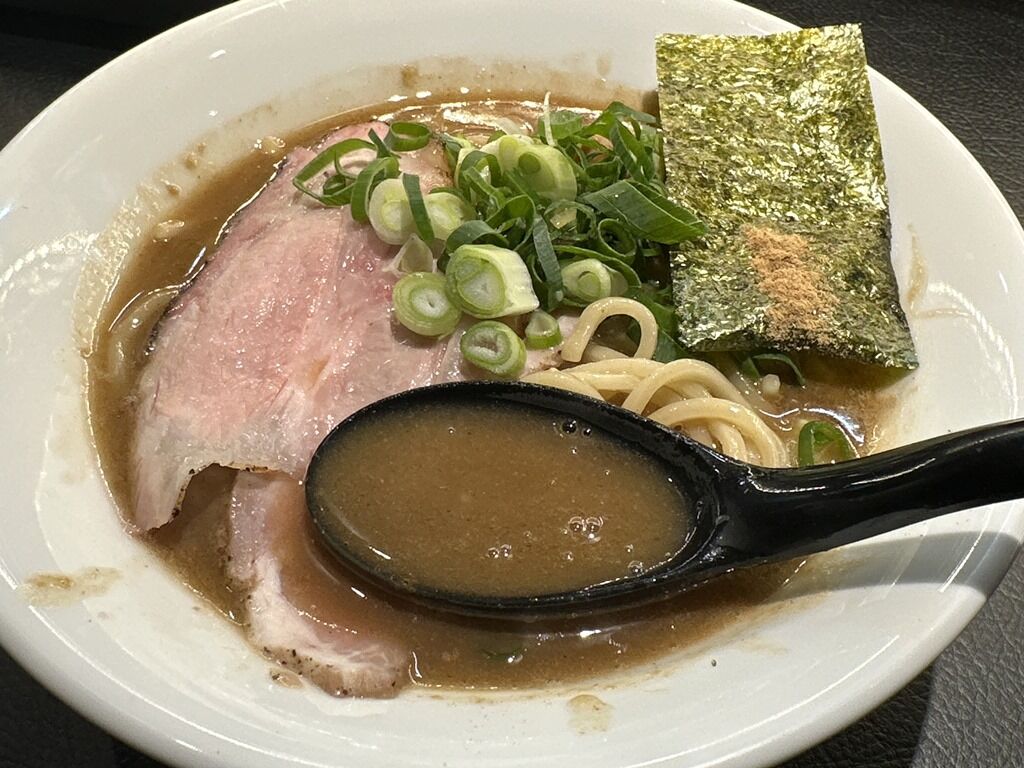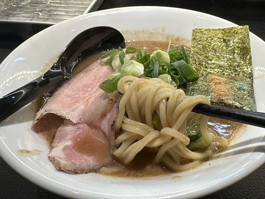 スープはとろっと濃厚な豚骨魚介醤油味。典型的なまたおま系ではく、圧倒的なそれ系。すごい破壊力とパワーで、口中でうま味が爆発するような感覚。ちょいしょっぱめですが、それ以上にうま味が鮮烈で猛烈。暴力的ともいえるビートとエナジーを感じる味わいですごく美味しい!