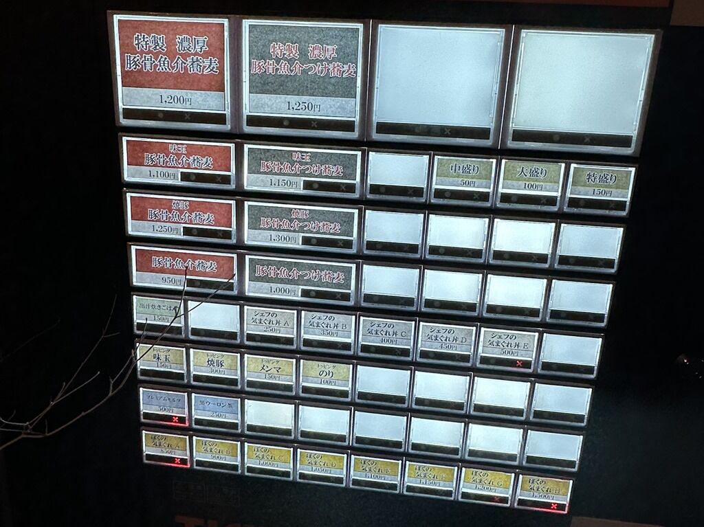 主なメニューは、濃厚豚骨魚介蕎麦950円、濃厚豚骨魚介つけ蕎麦1000円、味玉150円、特製+250円、出汁炊きご飯150円、他。