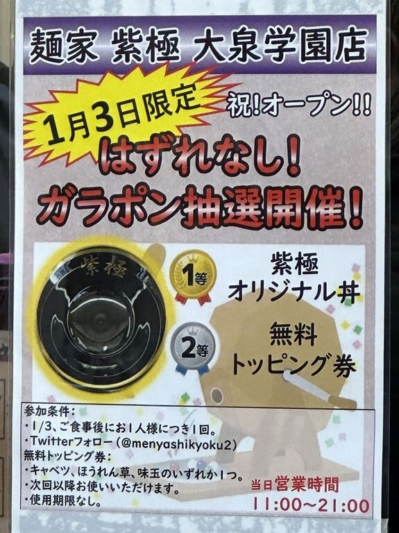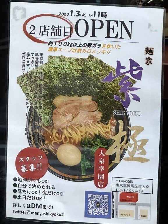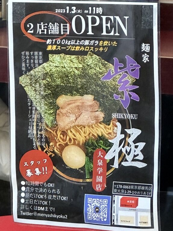 2023年1月3日大安、本日オープンの新店「麺家 紫極 大泉学園店」へ。