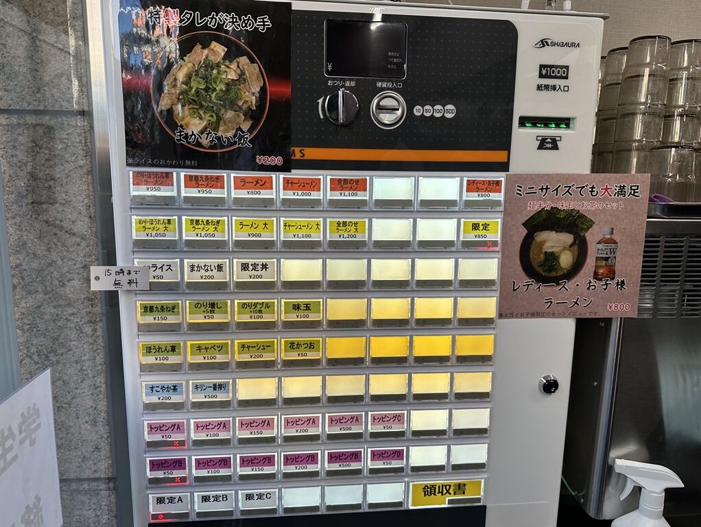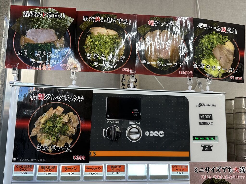 主なメニューは、ラーメン800円、のり・ほうれん草ラーメン950円、京都九条ねぎラーメン950円、まかない飯200円、♾ライス50円、他。