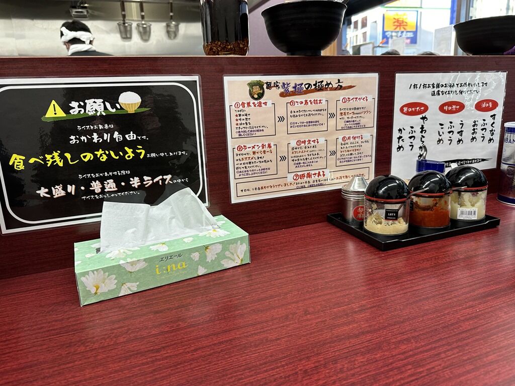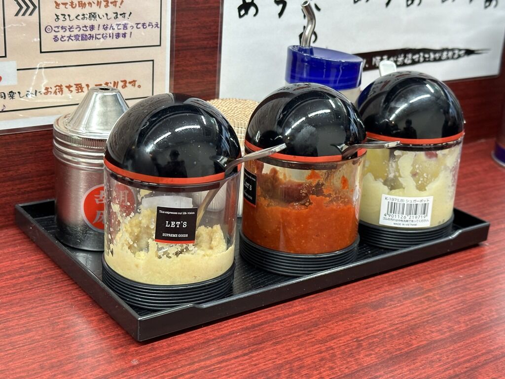 卓上調味料はGABANブラックペッパー、おろし生姜、一味唐辛子、おろしニンニク、酢。カウンター上にはニンニク醤油漬け、ライス用きゅうりのパリパリ漬け。