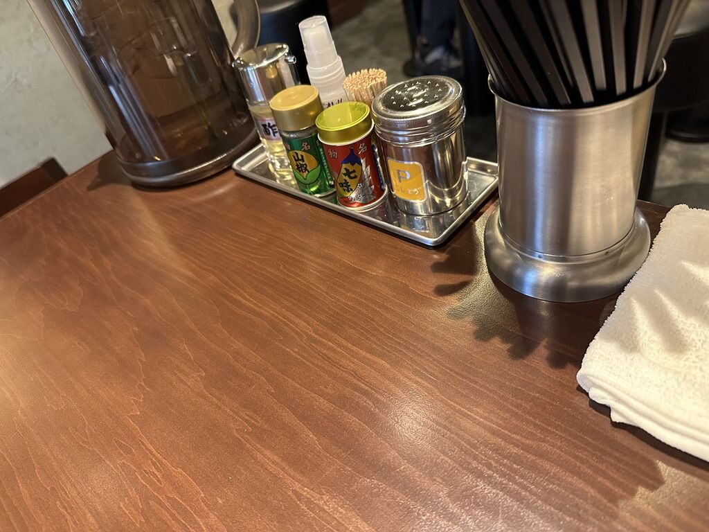 BGMはヒーリングミュージック。箸は洗い箸で資源環境に配慮。卓上調味料は、酢、八幡屋礒五郎七味唐からし・粉山椒、胡椒。