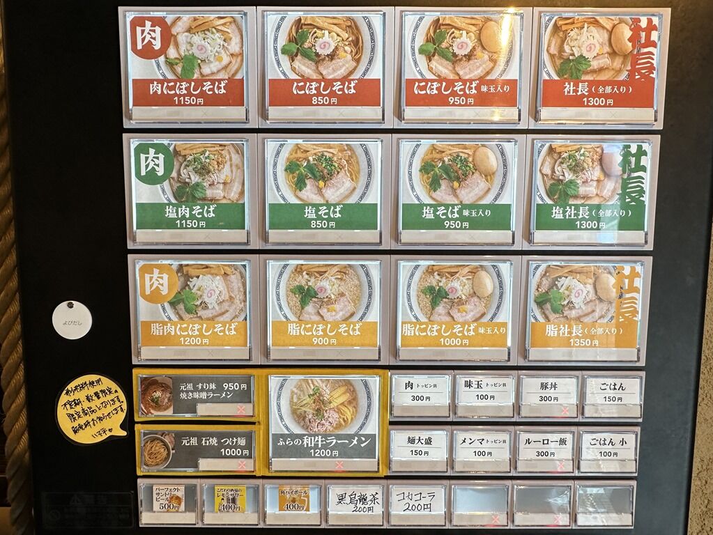 入店するとまず券売機で食券購入です。主なメニューは、にぼしそば850円、塩そば850円、脂にぼしそば900円、元祖すり鉢焼き味噌ラーメン950円、元祖石焼つけ麺1000円、ふらの和牛ラーメン1200円、社長(全部入り)+450円、他。