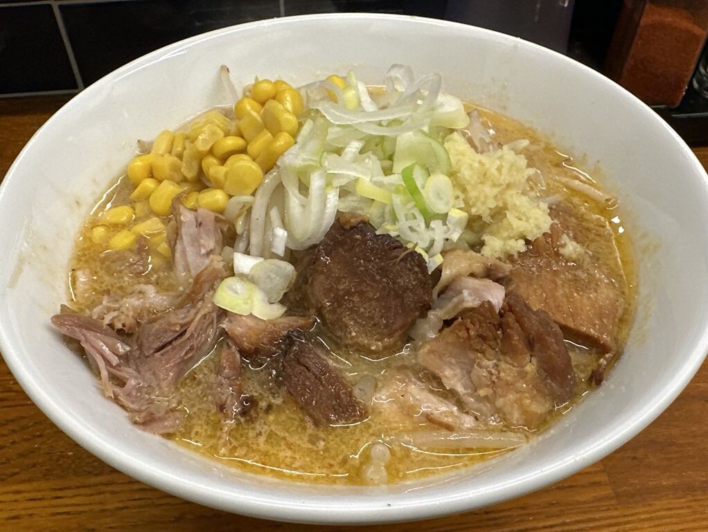 スープはとろっとコクのある濃厚味噌味。熱々での提供。味噌だれは、味噌4種、バター、ピーナッツバター、カシューナッツ、芝麻醤、甜麺醤、豆板醤、オイスターソース、すりごま、ニンニク、しょうが、山椒、ブラックペッパー、クミン、一味唐辛子、韓国産唐辛子、魚粉、日本酒、みりん、つけ麺のカエシ、スープ等、26種類の材料及び調味料で作り、数日寝かせて使用。味噌ダレと魚介系の清湯スープを、オーダー毎に小鍋で仕上げる製法。味噌のまろやかな風味と濃厚なコク、こってりとしたインパクトとしっかりとした旨みが渾然一体となって複雑で味わい深い一杯に。卓上の一味が実によく合います。寒い日に身体の芯から温まって、旨さの余韻がいつまでも続く心づくしの一杯ですごく美味しい!