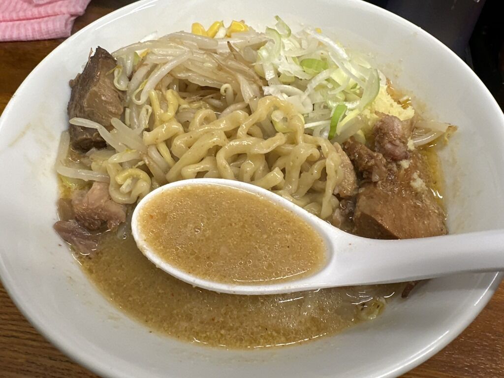 麺は浅草開化楼製をなんと2種類使用。①タピオカ粉使用の札幌味噌ラーメン風②傾奇者+全粒粉使用の加水率40%の多加水麺③開化楼と言えばチーメン!切り刃9番の極太平打ち麺、以上から最終的に2種類使用とのことですが、多分②と③かと。⇒①と②だそうです🤣ぷりっぷりの弾力麺にガチムチの剛麺の組み合わせが、実に楽しい食感を演出。ちょっと固茹過ぎなところも一部ありましたがご愛嬌。