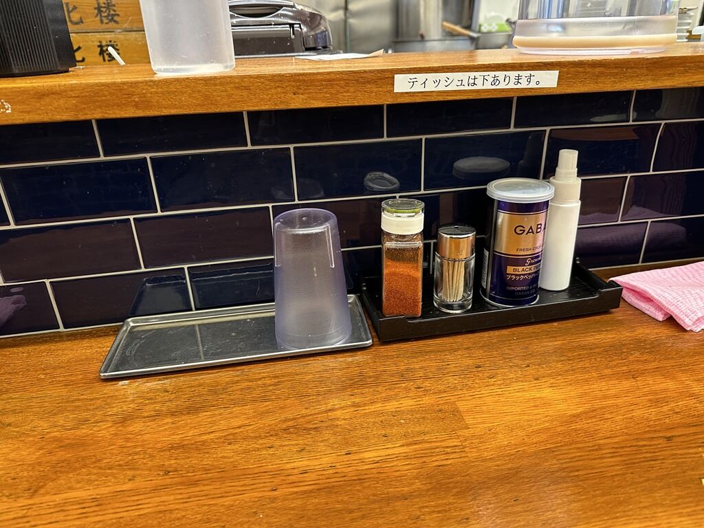 BGMはエバーグリーンポップス、イエスタデイ・ワンス・モアとか♪箸は割り箸。卓上調味料は一味唐辛子、GABANブラックペッパー、