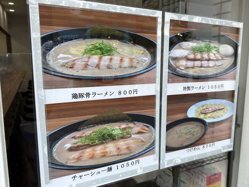 入店するとまず券売機で食券購入です。主なメニューは、鶏豚骨ラーメン800円、つけめん(並・中)850円、まぜそば800円、他。