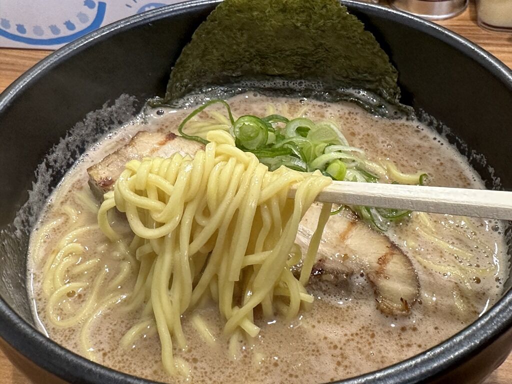 麺は三河屋製麺製のストレート中太タイプ。もちもち麺で麺単体でも美味。スープも麺も旨いのですが後半やや単調になるため、一味か豆板醤かカットレモンか、何か刺激的な味変があると最後まで楽しめそう。