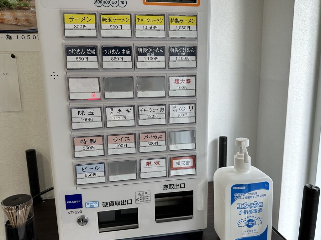 店内は厨房を囲むL字型カウンター12席(10・2)。1席ごとにアクリル板の仕切り設置。消毒液は券売機横に配置。