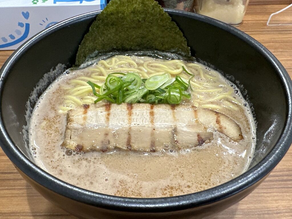 具はチャーシュー、小口切り青ねぎ、海苔。提供直前プレートで焼き上げたチャーシューは、くっきり焼目がついてラーメン全体がインパクトあるビジュアルに。そのチャーシューは厚さもあって食べ応え満点。