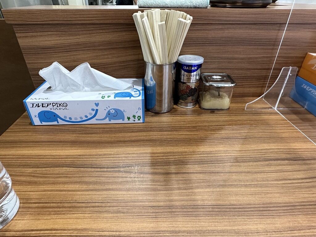 BGMはポップス。箸は割り箸。卓上調味料はGABANブラックペッパー、おろしにんにく。