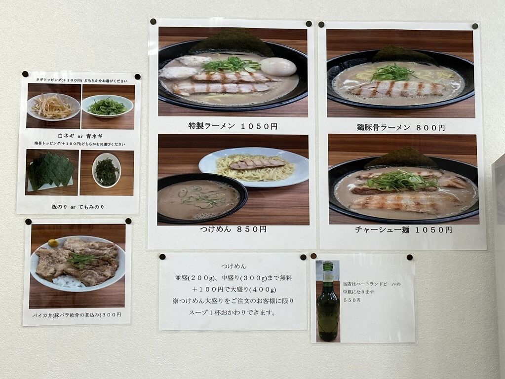 つけめんは麺量並盛200g、中盛300g同料金。ビール550円はハートランド。