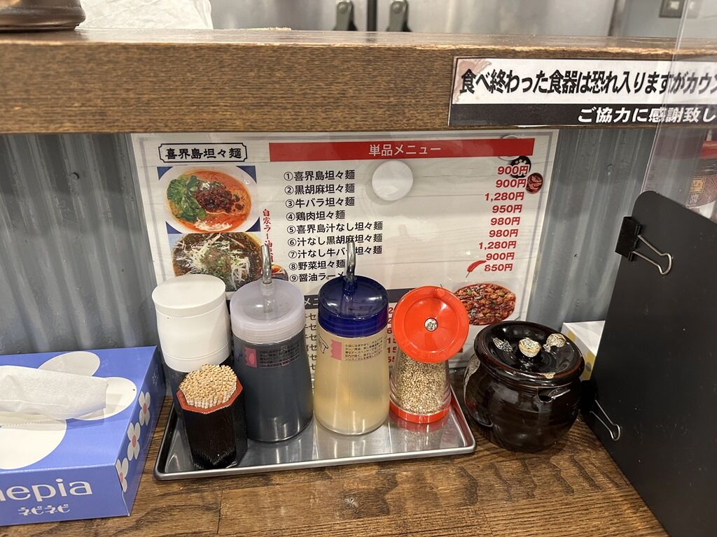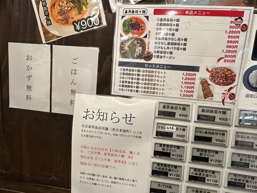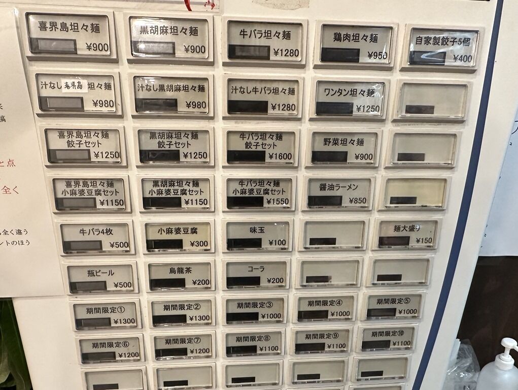 入店するとまず券売機で食券購入です。主なメニューは、喜界島坦々麺900円、黒胡麻坦々麺900円、汁なし喜界島坦々麺 980円、汁なし黒胡麻坦々麺980円、醤油ラーメン850円、他。