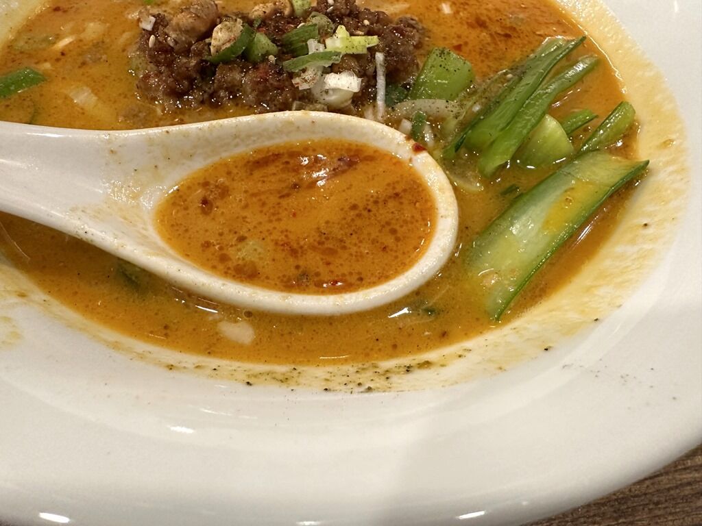スープは喜界島の胡麻を使用した担々胡麻味。喜界島の胡麻が高価なためか芝麻醤がやや弱めかな。痺辛も控えめ。胡麻は卓上のミルで胡麻すりして胡麻チャージ、辛味はラー油投入でブースト。痺れはアイテムが無くそのまま。担々麺専門店のゴッツい担々麺よりは、中華料理屋さんがつくる坦々麺的な、オーソドックスで王道の味わい。予定調和な期待通りの味でとても美味しい!