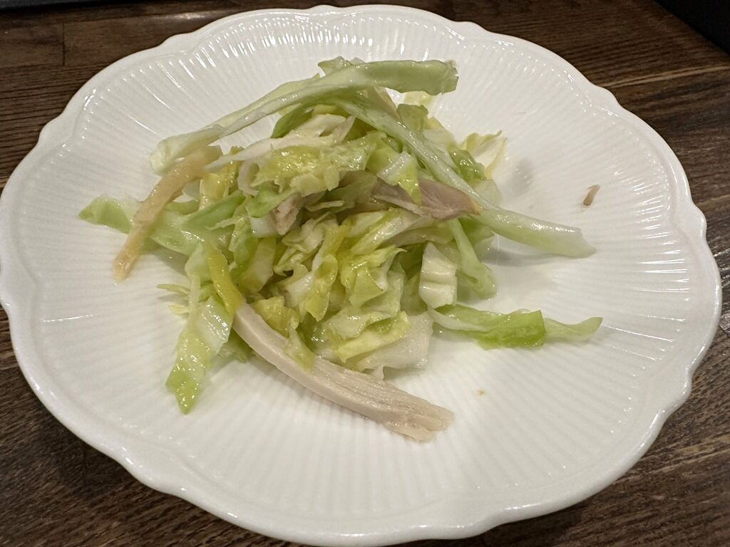 まず最初にアミューズ(サービスのおかず)が到着。この日のおかずは、キャベツとチャーシューのサラダにフレンチドレッシングがかかったキャベチャー。