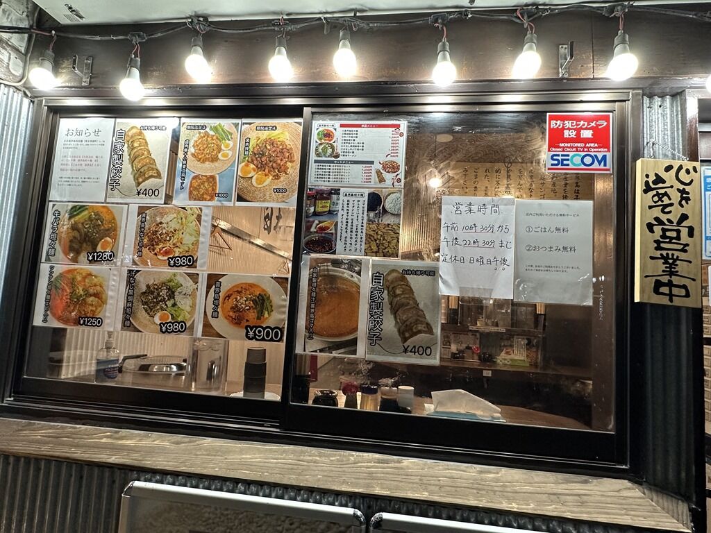 BGMはポップス。箸は割り箸。卓上調味料はペッパーミル入り胡椒、醤油、酢、すり胡麻、食べラー的ラー油。