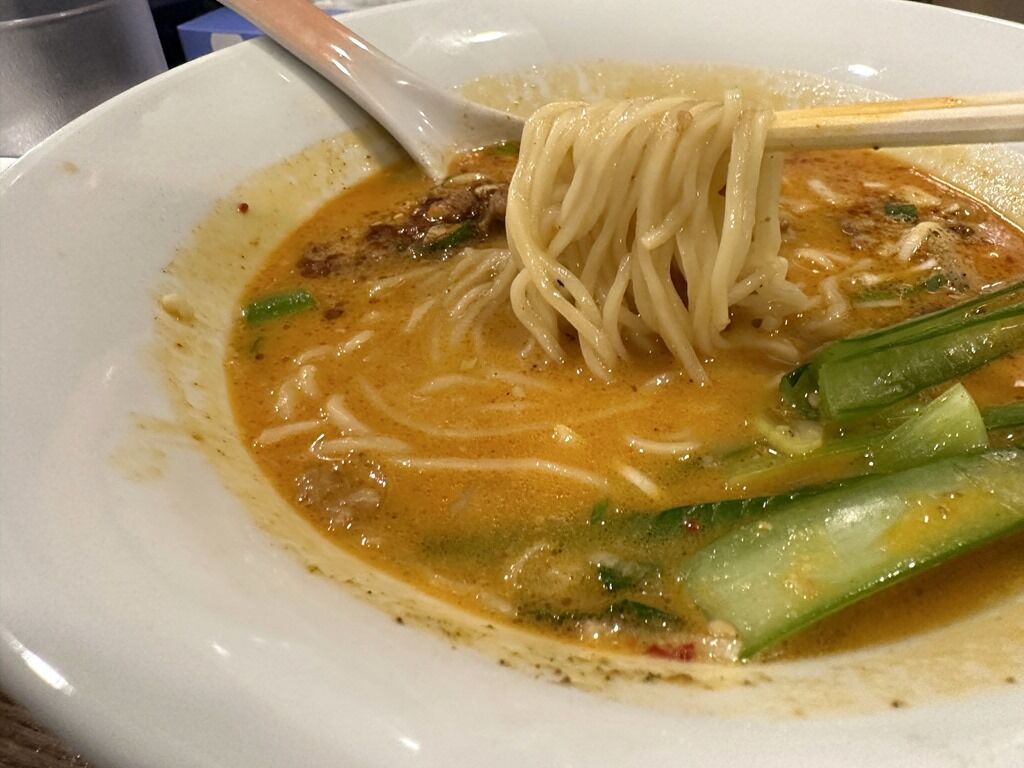 麺はストレート中太タイプ。なめらか&ツルシコ食感でマイルド担々スープにしっかりマッチ。