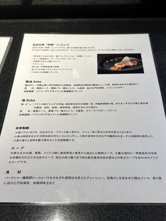 具は、黒豚肩ロース、黒豚バラ、極太メンマ、九条葱、品川江戸前海苔、トリフュパウダー。