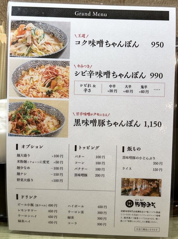 券売機は無くメニューを見て注文、伝票方式、食後奥のレジにて後会計制。主なメニューは、コク味噌ちゃんぽん950円、シビ辛味噌ちゃんぽん990円、黒味噌豚ちゃんぽん1150円、黒味噌豚の小丼350円、米粉麺(フォー)に変更-50円、麺少なめ-100円、麺大盛り・野菜大盛り+100円、他。