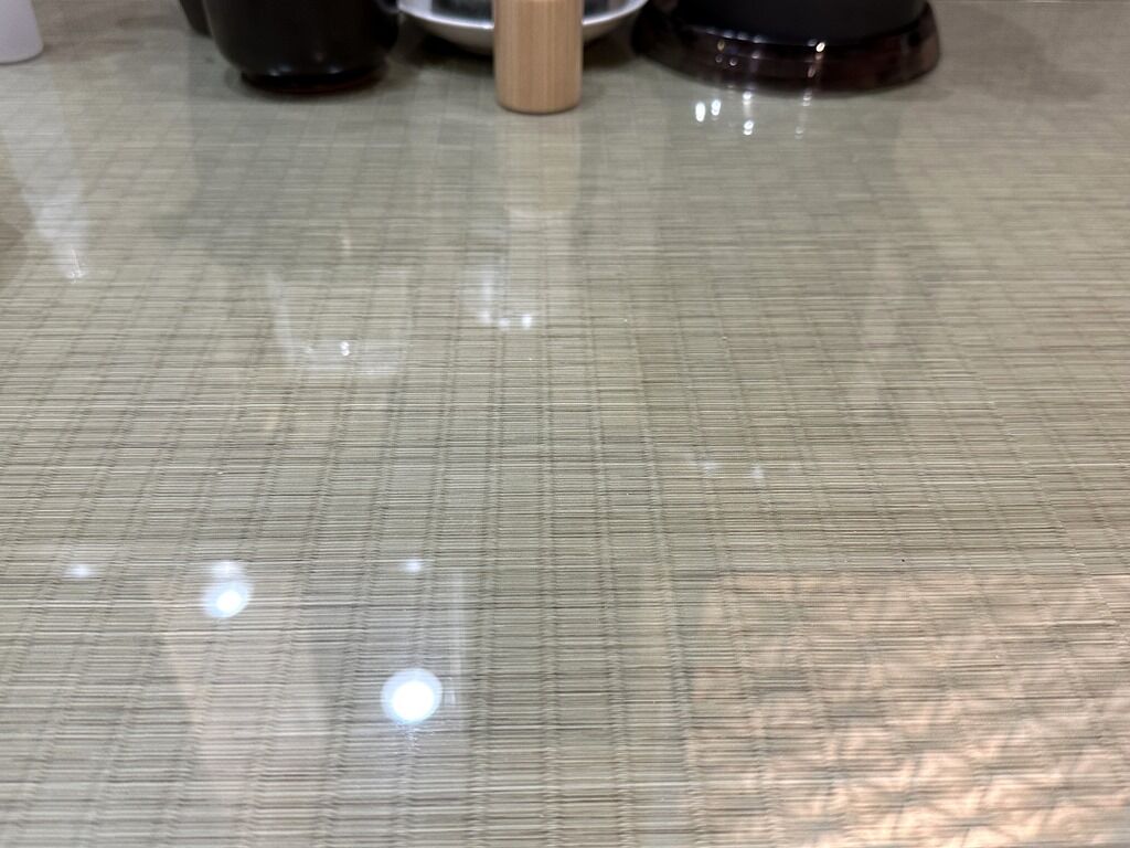 カウンターは上にガラスが乗せえてありますが畳張り。テーブル壁側のベンチシートの座面も井草張りでした。BGMは懐かしのJ-POP、きっと、また逢える…、LA・LA・LA LOVE SONG、センチメンタル、Face the change、どんなときも、他♪箸は割り箸。卓上調味料は無し。
