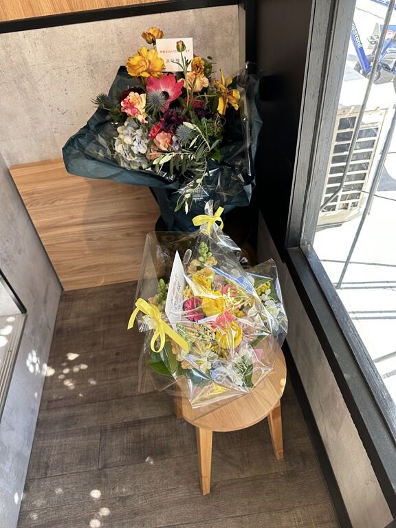店頭開店祝花は、せたが屋、町田汁場しおらーめん進化、鶏ポタラーメンTHANK、麺処びぎ屋、、他から。店主さんの挨拶から定刻ちょうどにオープン。