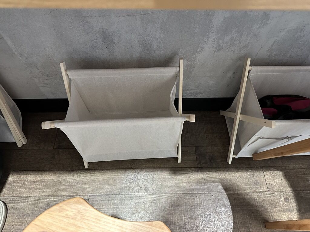 スタッフは店主さんと女性2。足元には折り畳み式荷物かごがあらかじめセット。