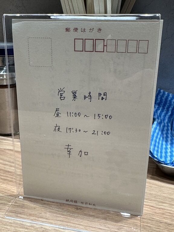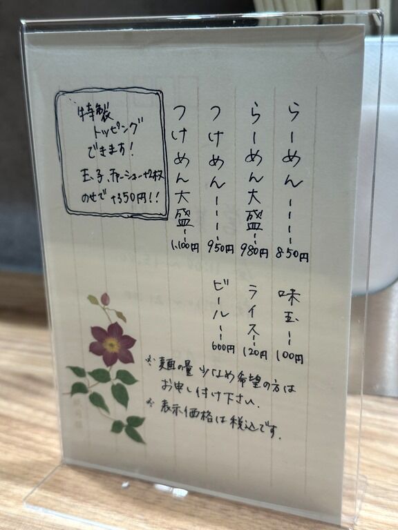 券売機は無くメニューを見て注文、伝票方式、食後レジにて後会計制。主なメニューは、らーめん850円、つけめん950円、味玉100円、特製350円、他。メニュー立てに入ったメニューカードは手書きの葉書き。