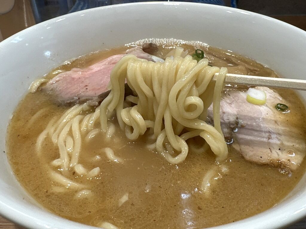 麺はストレート中太タイプ。オレンジ色の麺ケースがありましたが、製麺所名は確認できず。ツルモチで存在感があり濃厚魚介スープにぴったり。