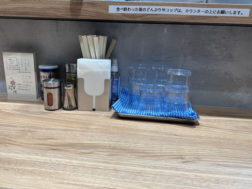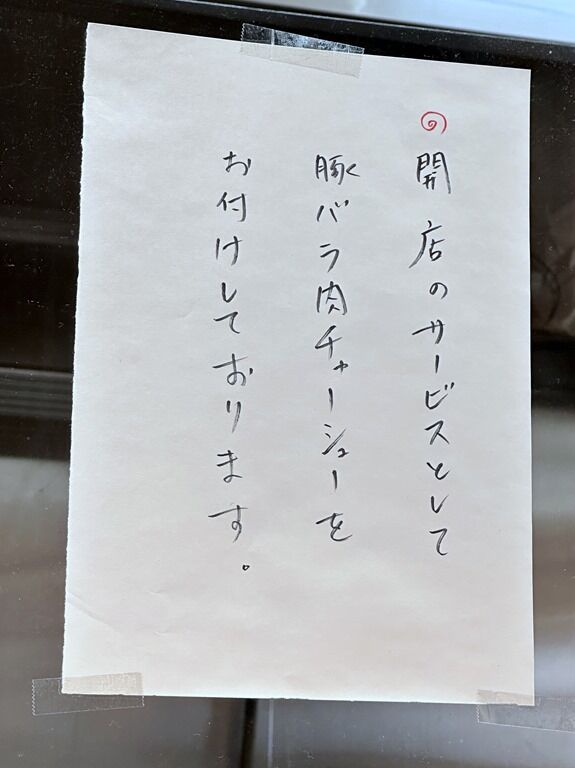 BGMは無し。箸は割り箸。卓上調味料はGABANブラックペッパー、一味唐辛子。オープン記念でバラチャーシュー1枚トッピング付き。