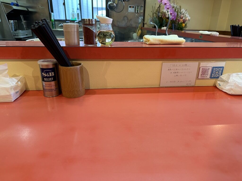 店内は厨房を囲むL字型カウンター12席(7・5)。7:10頃到着で先客後客無し。スタッフは店主さんワンオペ体制。朝らーめんの食券を渡すと生姜と大根おろしを入れて大丈夫か聞かれます。