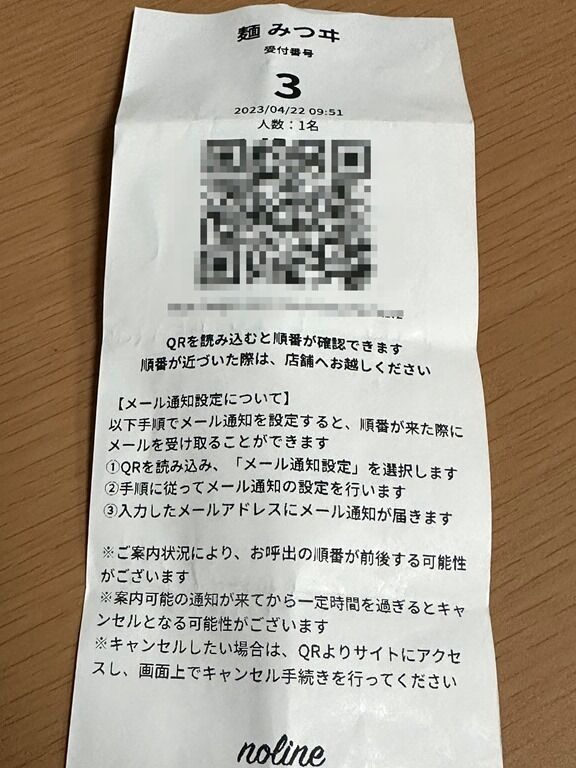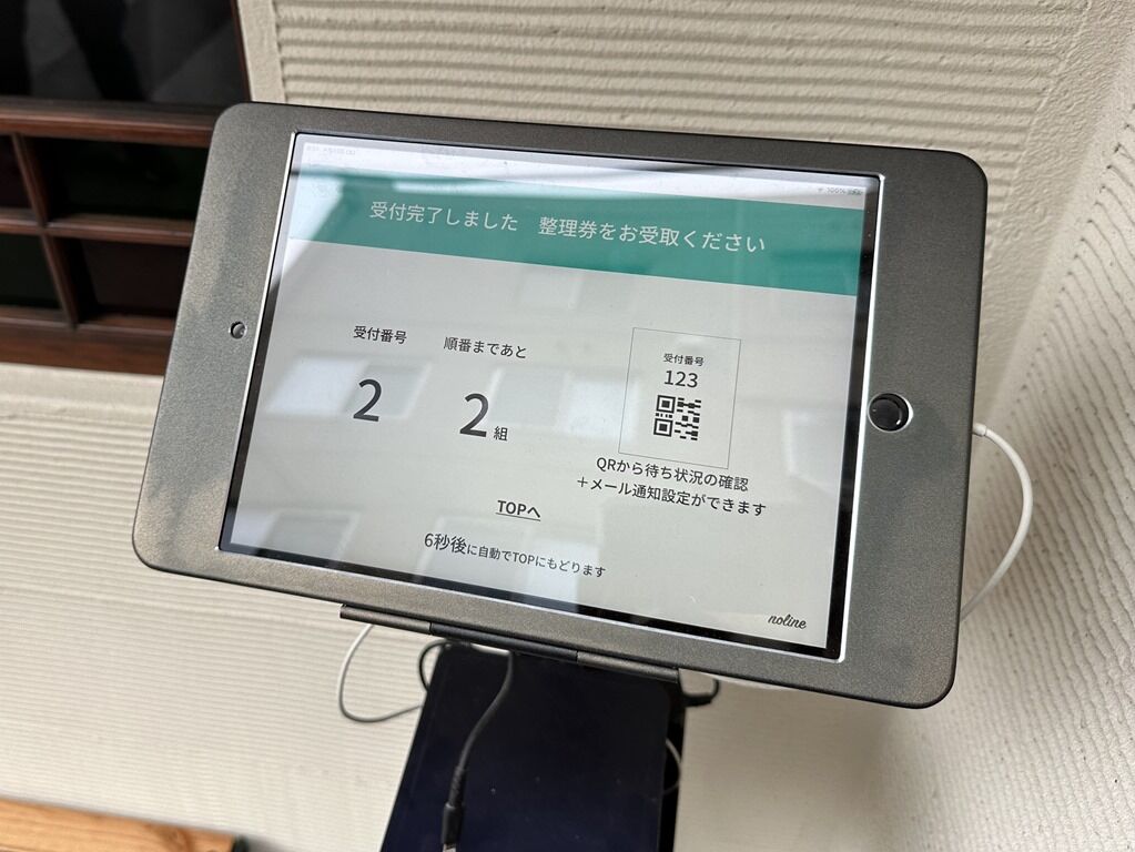 発券された整理券のQRコードを読み込んでメールアドレスを入力すると、後何組み目か順番が確認できます。また、メール通知設定すると、順番が近くなるとメールで知らせてくれます。