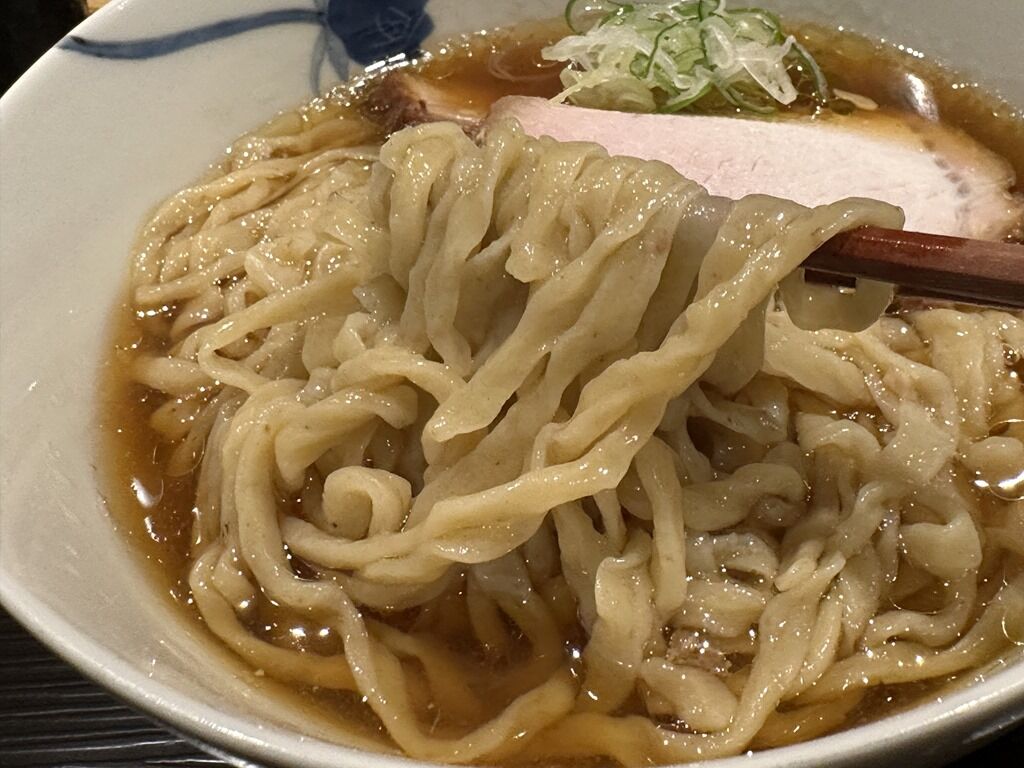 スープはさらさらの無化調清湯醤油味。丸鶏を使用した鶏の旨みほとばしる上品で洗練された芳醇で豊潤な味わい。後からほんのり魚介風味が追いかけてきて旨みがさらに加速。オープン当初いただいた時よりもさらに七彩イズムを感じるテイスト。旨みが沁み渡り、また心地よい余韻がしばらく持続します。無くなるのが惜しくなる愛おしいスープですごく美味しい!