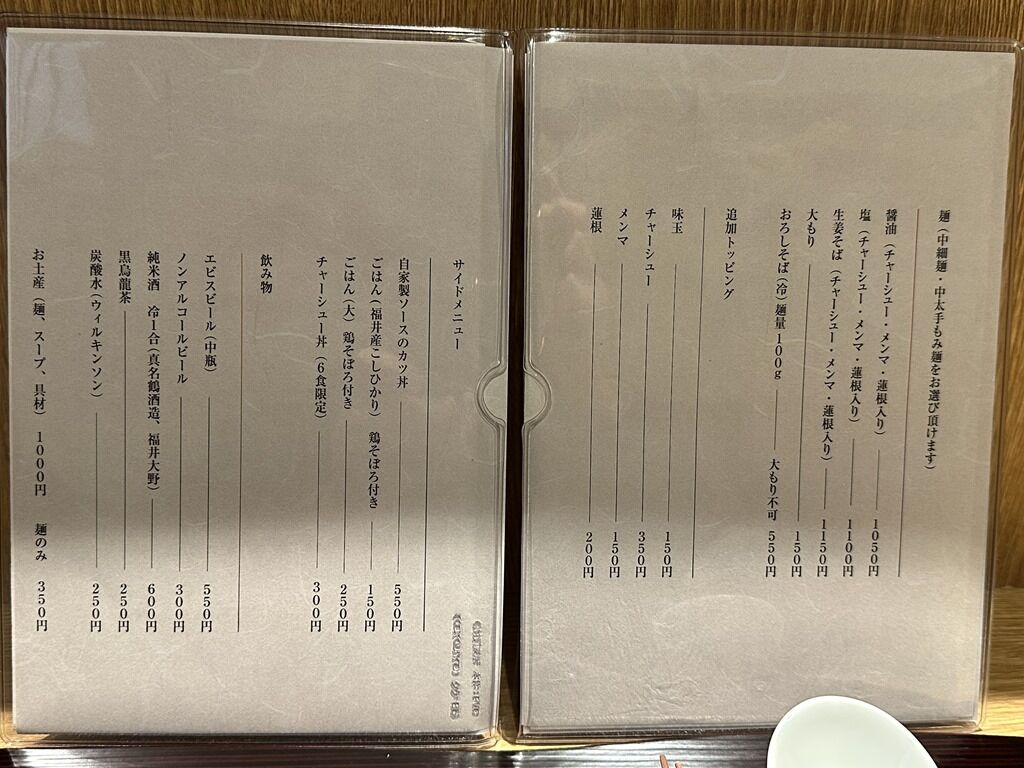 券売機は無く先会計制。主なメニューは、醤油1050円、塩1100円、生姜そば1150円、おろしそば(冷)麺量100g大盛不可550円、自家製ソースのカツ丼550円、チャーシュー丼(6食限定)300円、他。