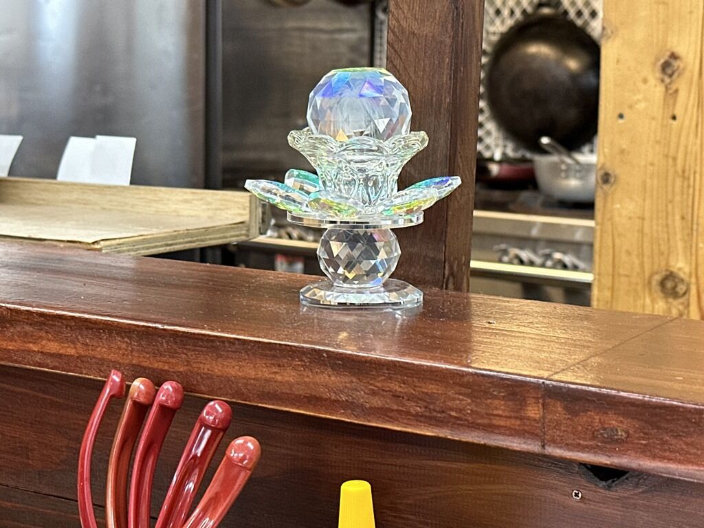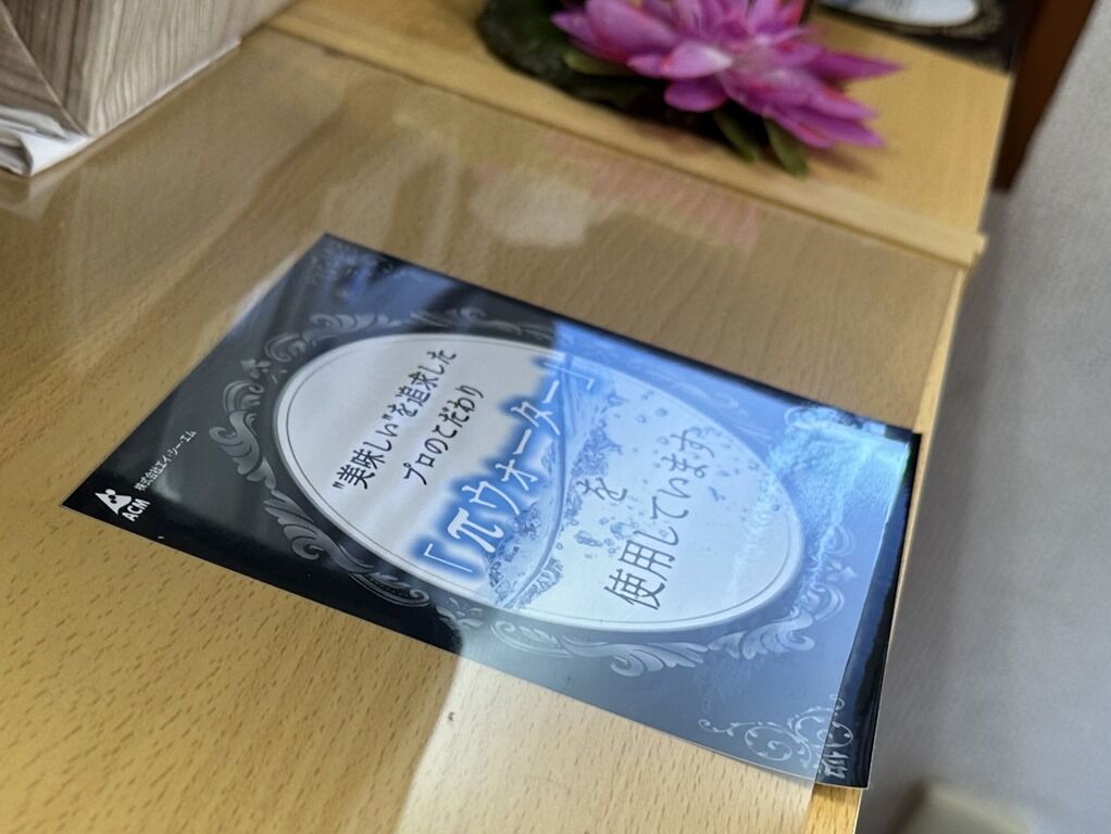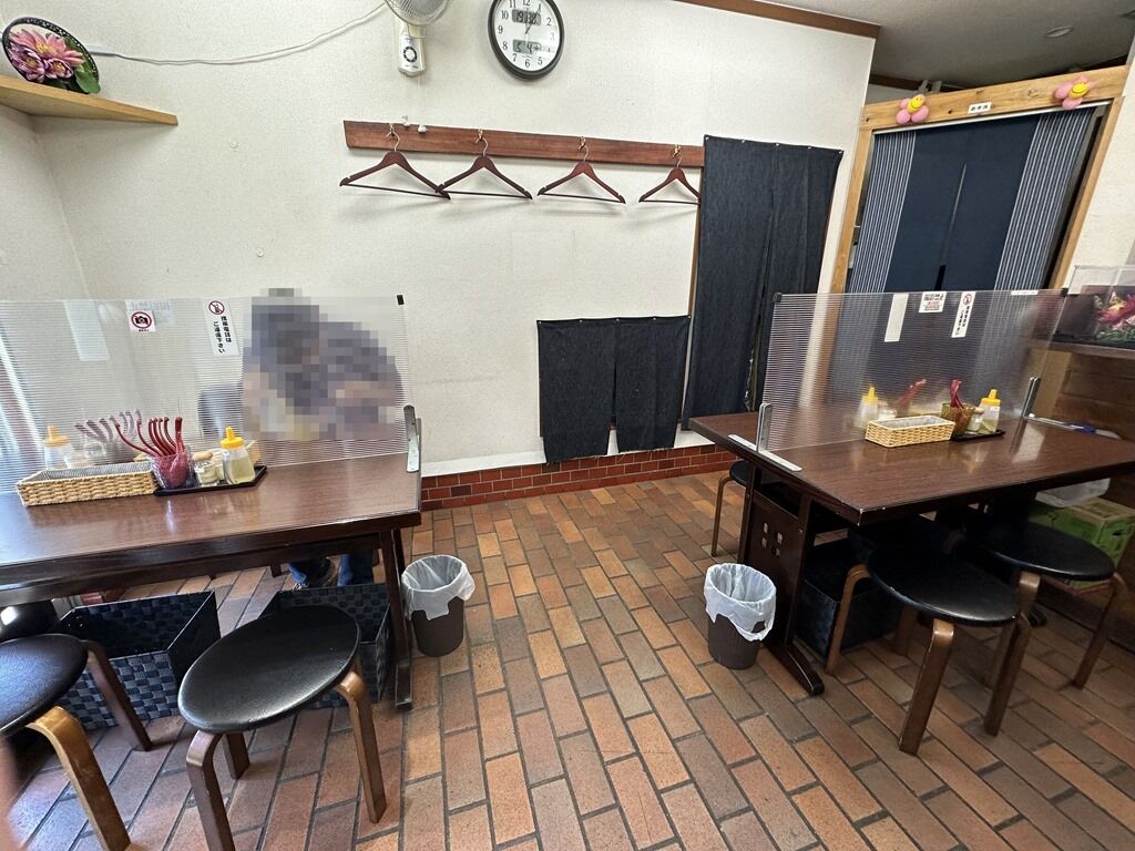 BGMはFM NACK5。箱ティッシュは給水機の上。箸は竹製の洗い箸で資源環境に配慮。卓上調味料はコショー、にぼし酢。
