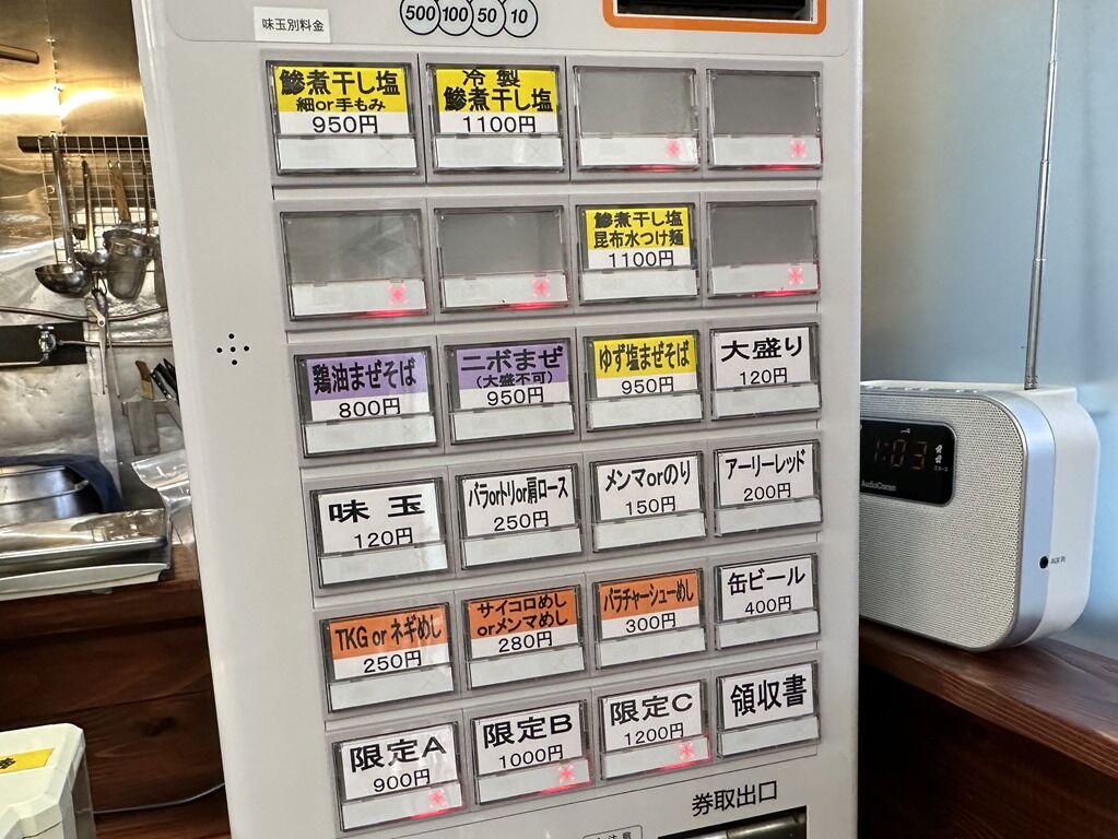 入店するとまず券売機で食券購入です。主なメニューは、鰺煮干しの塩ラーメン、冷製鰺煮干しの塩ラーメン1100円、鰺煮干しの塩昆布水つけ麺1100円、鶏油まぜそば800円、ニボまぜ950円、ゆず塩まぜそば950円、TKGorネギメシ250エン、サイコロメシorメンマめし280円、他。